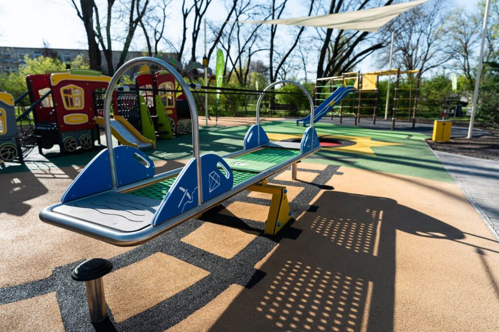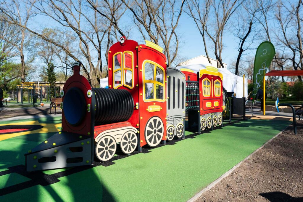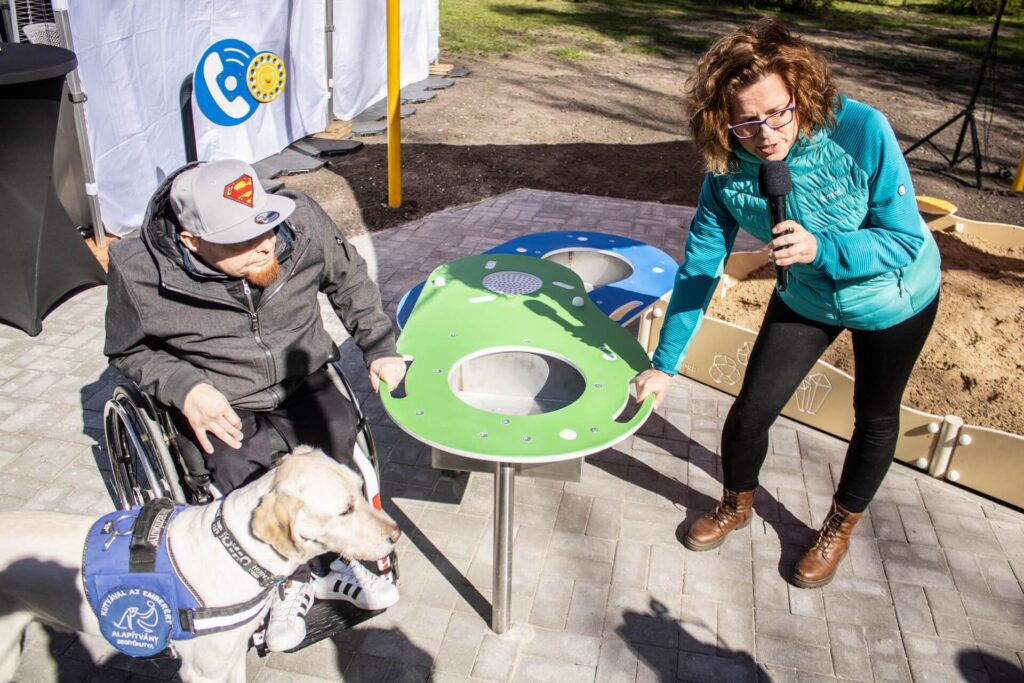 Az új befogadó közösségi tér egyik kiemelt játszóeszköze a süllyesztett trambulin, amit kerekesszékkel is lehet használni. Emellett számos, logikus gondolkodásra ösztönző edukációs feladat is vár a kilátogató gyermekekre. A játszótér mellett mozgássérült parkoló, a parkolótól a bejáratig pedig szilárd útburkolat is segíti a helyszín megközelítését.