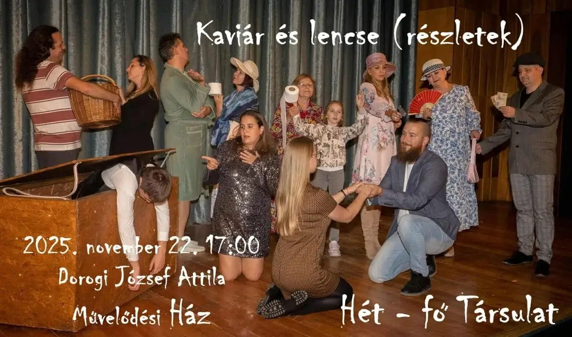 Kaviár és lencse Egy újabb izgalmas színházi előadás a HétFő Színtársulat tolmácsolásában. Az előadás megtekintése ingyenes. + Google Naptárba mentés + iCal / Outlook exportálás Dátum 2025 nov 22 Lejárt! Idő 17:00 - 18:00 Helyszín Dorogi József Attila Művelődési Ház Dorog Otthon tér 1. Telefon +36 33 737 930 Kategória Dorogi József Attila Művelődési Ház Hét-fő Színtársulat Szervező Hét-fő Színtársulat Esemény megosztása